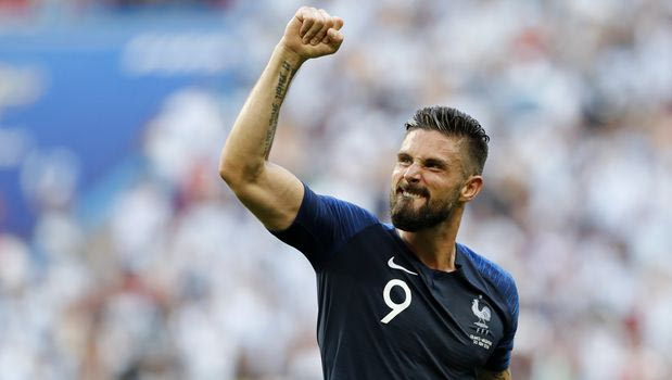 France's Olivier Giroud celebrates after the round of 16 match between France and Argentina, at the 2018 soccer World Cup at the Kazan Arena in Kazan, Russia, Saturday, June 30, 2018. (AP Photo/David Vincent)