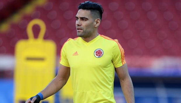 Colombia's Radamel Falcao attends the official training on the eve of the match between Colombia and England at the 2018 soccer World Cup in the Spartak Stadium in Moscow, Russia, Monday, July 2, 2018. (AP Photo/Alexander Zemlianichenko)