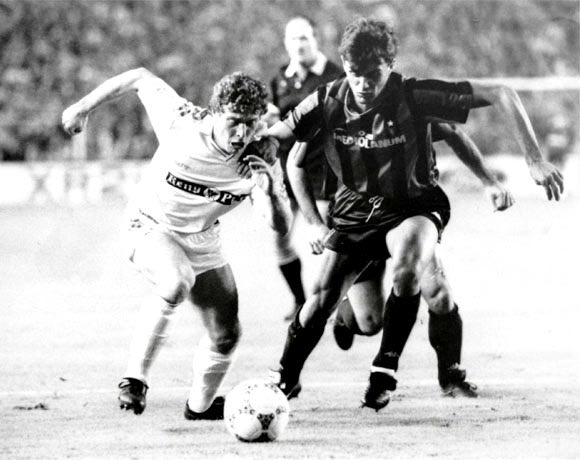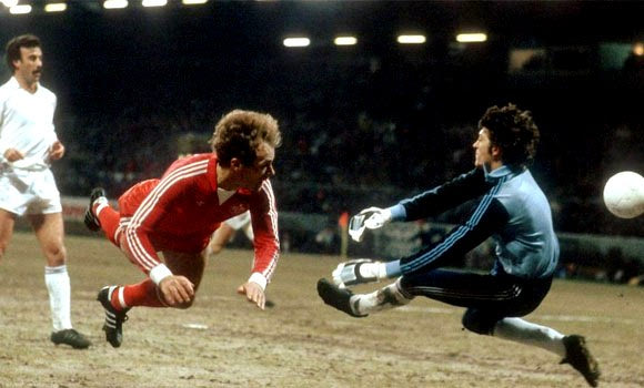Ο Νόρμπερτ Άιλενφελντ πετυχαίνει το 4-0 για την Κάιζερσλαουτερν. Αριστερά ο Βιθέντε ντελ Μπόσκε (17/3/1982)