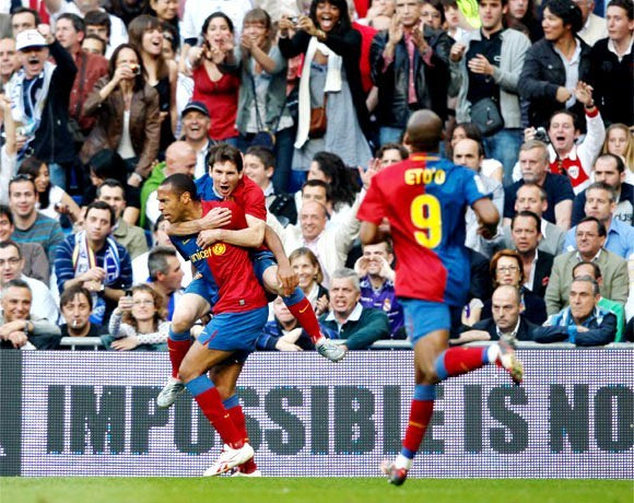 Ανρί και Μέσι πανηγυρίζουν, ενώ ο Ετό τρέχει προς το μέρος τους (2/5/2009)