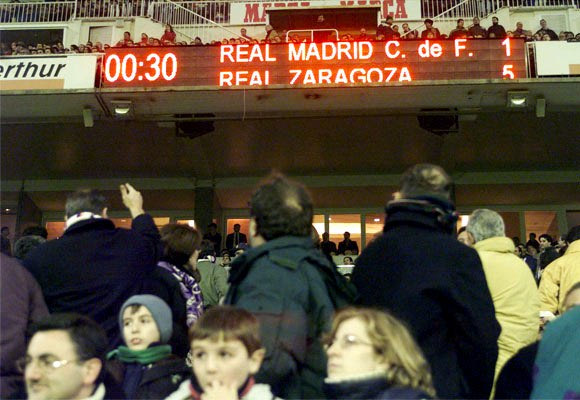Περνάμε τώρα σε δυο μεγάλες εντός έδρας ήττες των “μερένγκες” στο πρωτάθλημα, αμφότερες με το ίδιο σκορ. Πρώτα η “μανίτα” της Σαραγόσα του Τσέτσου Ρόχο με μεγάλους πρωταγωνιστές τους Μιλόσεβιτς και Χουανέλε. Οι φιλοξενούμενοι έκλεισαν το ημίχρονο με το εμφατικό 0-3 και μόλις ο Ραούλ μείωσε σε 1-3, πέτυχαν ακόμα δυο γκολ για να γράψουν το τελικό 1-5, ένα από τα πιο σημαντικά αποτελέσματα στην ιστορία των φιλοξενούμενων.