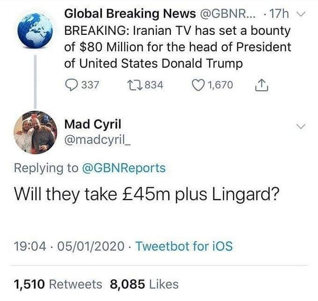 Ο Πορτοκαλής βλέπετε ξεπάστρεψε τον Κασέμ τον Σολεημάνι με ντρόουν (όχι από αυτά του Κωτσόβολου, κάτι άλλα με γκάνια πάνω) και πολύ φορτώσανε στο Ιράν επειδή η κίνηση του Τραμπ ήταν περίπου σαν να είχανε πάει οι Ιρανοί και να είχαν κόψει το λαρύγγι του Αμερικάνου Υπουργού Άμυνας. Χαμός κοινώς. Έξαλλοι οι του Ιράν, βγήκανε στους δρόμους και στα μπαλκόνια, «ντεθ του Αμέρικα» φωνάζανε και στο Twitter profile του Global Breaking News, πέφτει η θεματάρα: “Η Ιρανική τηλεόραση επικήρυξε τον Ντόναλντ Τραμπ, προσφέροντας 80 εκατομμύρια δολάρια για την κεφαλή του”.