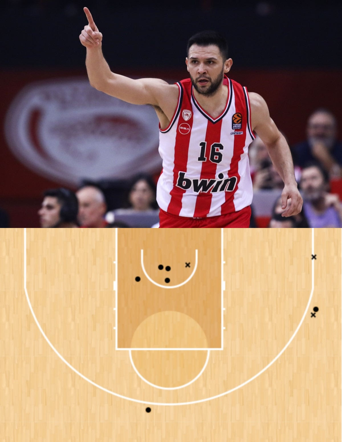 Ο Κώστας Παπανικολάου έδωσε ακόμα ένα ρεσιτάλ. Ο αρχηγός των “ερυθρόλευκων” είχε 14 πόντους με 4/5 δίποντα και 2/4 τρίποντα, 7 ριμπάουντ και 4 ασίστ (από τις οποίες ο Ολυμπιακός πήρε άλλους 8 πόντους) σε 28 λεπτά συμμετοχής, αλλά και +21 στο σύστημα +/-, όσο και ο Νάιτζελ Γουίλιαμς-Γκος. Ιδού και το Shot Chart του: