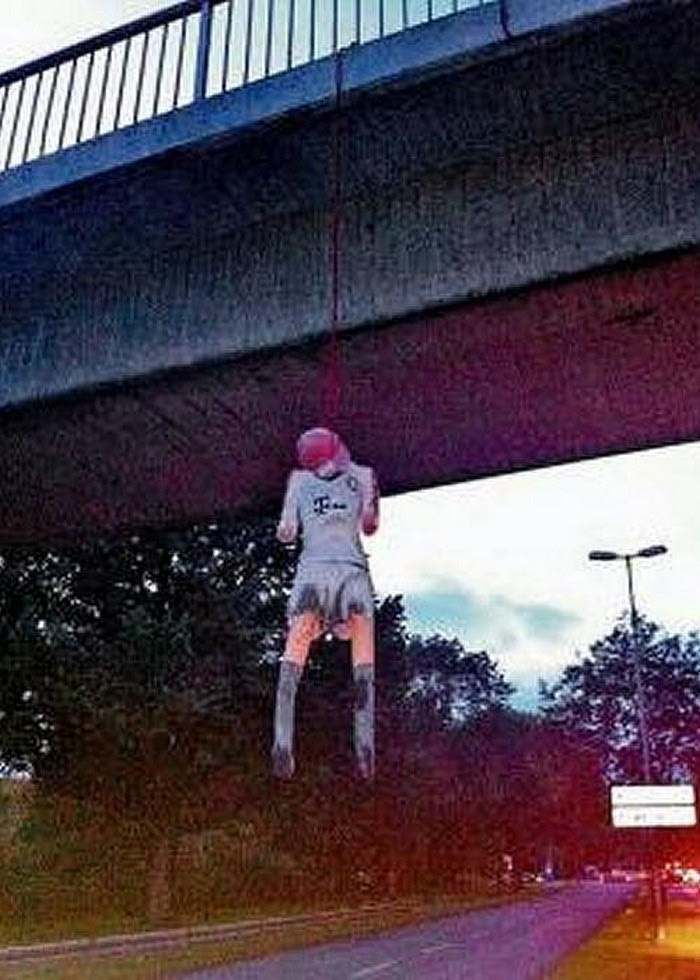 Συγκεκριμένα, σε κοντινή απόσταση από τη “Βέλτινς Αρένα” η οποία υποδέχτηκε το Σάββατο το μεγάλο ντέρμπι Σάλκε-Μπάγερν, κρέμασαν σε γέφυρα κούκλα ντυμένη με τη στολή του Νόιερ στους Βαυαρούς, ξέροντας ότι το πούλμαν της Μπάγερν επρόκειτο να περάσει από το συγκεκριμένο σημείο στο δρομολογιό του για το γήπεδο.