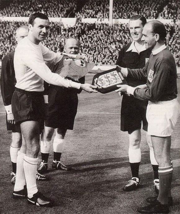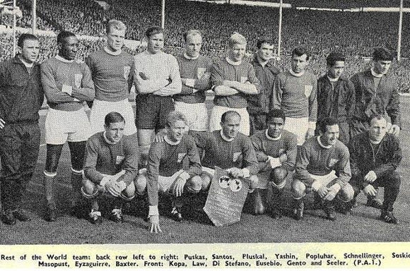 Η είσοδος των δυο ομάδων στον αγωνιστικό χώρο. Αριστερά ο αρχηγός της Μικτής Κόσμου, Ντι Στέφανο και πίσω του ο Πούσκας. Δεξιά ο αρχηγός της Αγγλίας, Τζίμι Άρμφιλντ και πίσω του ο Μπόμπι Μουρ.