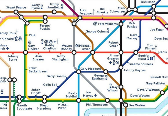 Τμήμα του Μετρό του Λονδίνου με τα ονόματα ποδοσφαιριστών στους σταθμούς του. Διακρίνονται αριστερά οι σταθμοί Μαραντόνα, Πελέ, Κρόιφ, Πούσκας, Μπέκενμπαουερ, Πλατινί, Μαλντίνι κλπ.