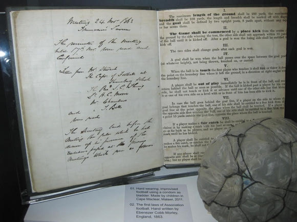 Οι αυθεντικοί χειρόγραφοι κανονισμοί του ποδοσφαίρου από τον Εμπενίζερ Κόμπ Μόρλεϊ, όπως εκτίθενται σήμερα στο Εθνικό Μουσείο Ποδοσφαίρου της Αγγλίας στο Μάντσεστερ.