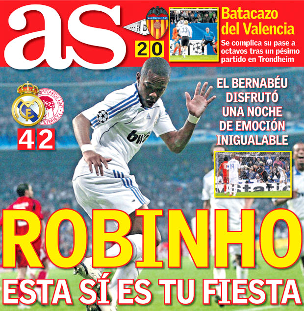 Το πρωτοσέλιδο της As την επόμενη του αγώνα με κεντρικό τίτλο “Ρομπίνιο, αυτή, ναι, είναι η δική σου φιέστα” και υπότιτλο “το Μπερναμπέου έζησε μια ανεπανάληπτη βραδιά συγκινήσεων” (25/10/2007)