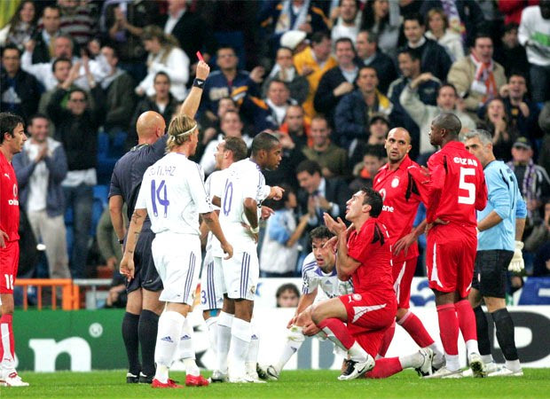 Η Ρεάλ ξεκίνησε με 4-4-2 και ο Ολυμπιακός με 4-3-2-1 (τρεις αμυντικούς μέσους). Οι “μερένγκες” έφτασαν στο 1-0 μόλις στο δεύτερο λεπτό, μετά από το λάθος του Άντζα, το κλέψιμο του Ρομπίνιο και την κάθετη πάσα του Βραζιλιάνου στον Φαν Νίστελροϊ, ο οποίος σούταρε, ο Νικοπολίδης απέκρουσε, αλλά στην επαναφορά ο Ραούλ δεν δυσκολεύτηκε να στείλει τη μπάλα στα δίχτυα. Μόλις πέντε λεπτά αργότερα, ο Τζόρτζεβιτς “χόρεψε” τον Σαλγάδο από τα αριστερά, έκανε το γύρισμα στον Γκαλέτι, που πλάσαρε υποδειγματικά με το αριστερό και έφερε το ματς στα ίσια. 1-1 και πανικός στην “ολυμπιακή” κερκίδα. Το ίδιο όμως και στα δημοσιογραφικά, με τους Έλληνες συναδέλφους να πανηγυρίζουν έξαλλα το γκολ. Άλλο ένα πεντάλεπτο μετά, ο Νίστελροϊ δέχτηκε κάθετη πάσα από τον Γκούτι και ανατράπηκε καθαρά από τον Βασίλη Τοροσίδη λίγο έξω από τη μεγάλη περιοχή. Ο Οβρεμπό έδειξε απευθείας κόκκινη κάρτα στον “Τόρο”, θεωρώντας ότι ο Ολλανδός επιθετικός βρισκόταν σε προφανή θέση για γκολ.