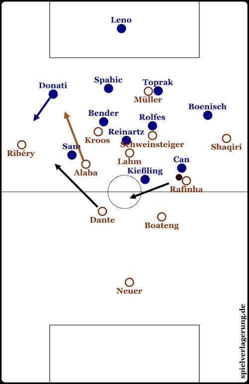 Μακρινές διαγώνιες πάσες από τους στόπερ στην επίθεση, διαγώνιες πάσες από το πλάι (cutbacks, θα το πιάσουμε άλλη φορά αυτό), διαγώνιες κινήσεις από τους επιθετικούς και διαγώνιες κινήσεις από τους μπακ. Κυρίως από τον Alaba (και τον Lahm όταν παίζει στην άμυνα). Γιατί διαγώνια; Επειδή είναι πιο εύκολο να βρεθούν χώροι. Επειδή η αντίπαλη άμυνα έχει μάθει να κινείται κατά βάση οριζόντια και κάθετα. Γιατί ο στόχος είναι να βρεθεί ο παίκτης σε mixed position; Επειδή δε θα είναι ούτε τόσο κοντά στη γραμμή-τον-καλύτερο-αμυντικό που περιορίζει τις επιλογές (μπορείς να κινηθείς/πασάρεις πίσω, μπροστά ή προς τα μέσα, αλλά όχι προς τα έξω), αλλά ούτε και στον μεγάλο χαμό του άξονα. Κάπου ενδιάμεσα. Κι αυτό προκαλεί μπέρδεμα κι αναστάτωση στην αντίπαλη άμυνα. Είναι πιθανό να βγάλεις περισσότερους αντιπάλους εκτός θέσης και την άμυνα εκτός ισορροπίας. Είναι πιο εύκολο ο επιτιθέμενος να κάνει τη σωστή επιλογή.
