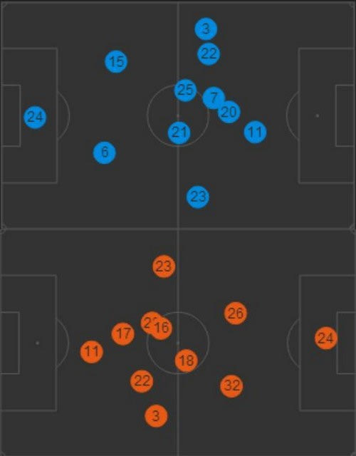Κι επειδή οι συγκεκριμένοι παίκτες έχουν περισσότερο εκτελεστικό ρόλο, κι επειδή παίζουν ψηλά και ο αριστερός και ο δεξιός μπακ. Για του λόγου το αληθές, μπορείτε να δείτε τα παρακάτω γραφήματα από το whoscored.com. Το πρώτο είναι από το εντός έδρας ματς με τη WBA και το δεύτερο από το εκτός με τη Stoke. Και στις δύο περιπτώσεις οι Coleman (23) και Baines (3) στη μεγαλύτερη διάρκεια του αγώνα βρίσκονταν στο μισό του αντιπάλου.