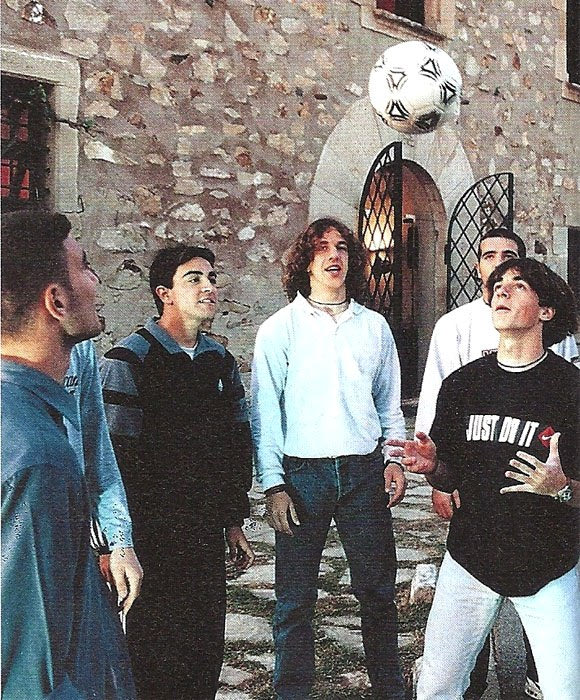 Χριστουγεννιάτικα κάλαντα στη Μασία. Αριστερά ο μικρός Ινιέστα, αριστερά από τον Ρόμπσον ο Ρέινα και πίσω δεξιά διακρίνεται ο Πουγιόλ (1996)