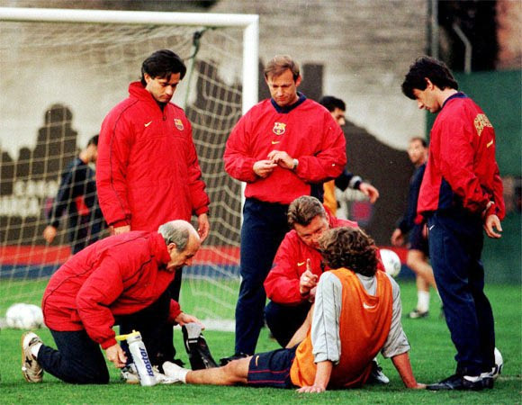Ο Πουγιόλ ακούει τις οδηγίες του Φαν Χάαλ ενώ παράλληλα δέχεται τις ιατρικές περιποιήσεις. Όρθιος αριστερά, ο Ζοζέ Μουρίνιο (24/2/2000)