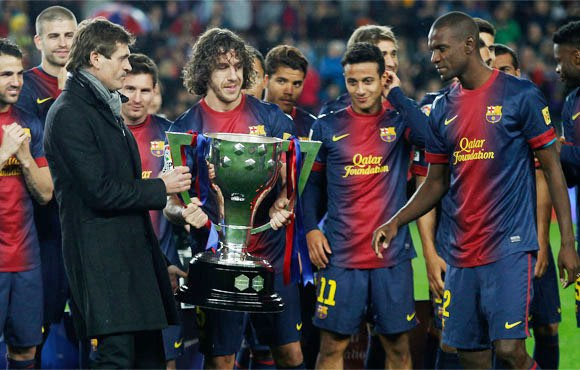 Ο Πουγιόλ έτοιμος να δώσει το Κύπελλο του Πρωταθλήματος στους Τίτο Βιλανόβα και Ερίκ Αμπιντάλ για να το σηκώσουν ψηλά. Χειρονομίες που τιμούν πρώτα απ’ όλα τον ίδιο τον αρχηγό (2013)