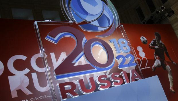 The bid logo is seen during the official presentation of the Russia's bid to host the soccer World Cup championships, during the unveiling of the bid in Moscow, Russia, Friday, Oct. 9, 2009. Russia unveiled its plans to host one of the upcoming World Cup soccer championships with a joint bid to host either the 2018 or 2022 events, ready for the successful bid to be announced by FIFA on Dec. 2, 2009. (AP Photo/Ivan Sekretarev)