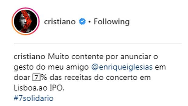 Τη σχετική ανακοίνωση έκανε μέσω του προφίλ του στο instagram ο άσος της Ρεάλ Μαδρίτης, τονίζοντας: “Είμαι στην ευχάριστη θέση να ανακοινώσω την χειρονομία του φίλου μου Ενρίκε Ιγκλέσιας να δωρίσει το 7% των εσόδων από τη συναυλία του στη Λισαβόνα, για την IPO”. Από την πλευρά του ο τραγουδιστής σχολίασε: “Είναι τιμή να υποστηρίξω μια τόσο απίστευτη υπόθεση μαζί με τον Κριστιάνο, σε ευχαριστώ πρωταθλητή”.
