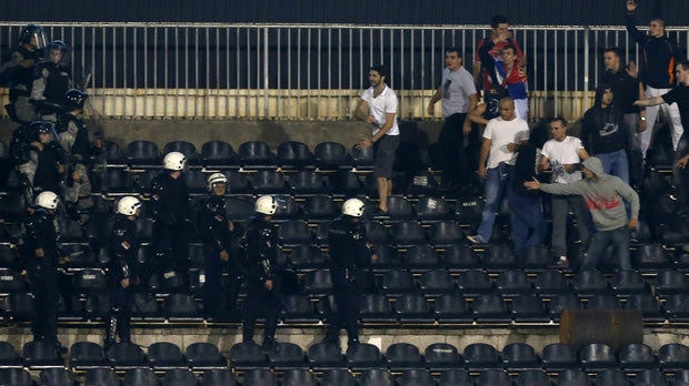 Οι φωτοβολίδες συνεχίζουν να πέφτουν στον αγωνιστικό χώρο, ενώ κάποιοι Σέρβοι προσπαθούν να εισβάλλουν σε αυτόν και συγκρατούνται από τους security, την ώρα που ένα μπουκάλι προσεγγίζει απειλητικά τον Μπεκίμ Μπάλαϊ.
