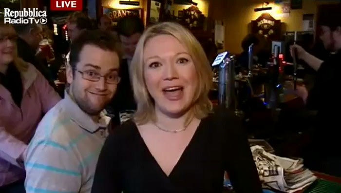 Εκείνος συνέχισε ωστόσο ακάθεκτος να προσφέρει ένα μοναδικό τηλεοπτικό σόου, με τη ψύχραιμη δημοσιογράφο του BBC να δείχνει απίστευτο επαγγελματισμό και να συνεχίζει το ρεπορτάζ της σαν να μην συνέβαινε τίποτα το ασυνήθιστο γύρω της.