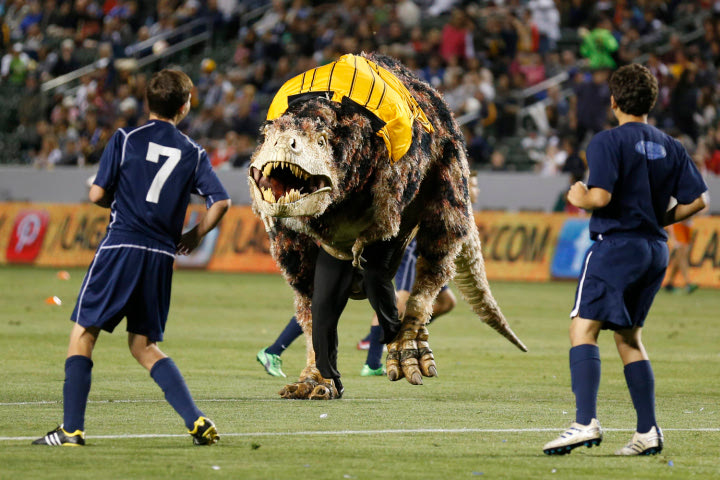 May 26, 2013. A Tyrannosaurus Rex dinosaur costume runs on the field as young boys play an exhibition soccer match during halftime of the MLS soccer game between the Los Angeles Galaxy and Seattle Sounders FC in Carson, California. The dinosaur was on the field to promote the Natural History Museum of Los Angeles County.