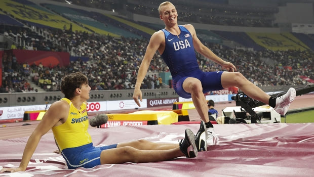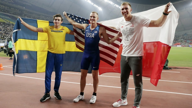 Gold medal winner Sam Kendricks, center, of the United States, poses with silver medal winner Armand Duplantis, left, of Sweden. and bronze medal winner Piotr Lisek, right, of Poland, after the the men's pole vault final at the World Athletics Championships in Doha, Qatar, Tuesday, Oct. 1, 2019. (AP Photo/Hassan Ammar)