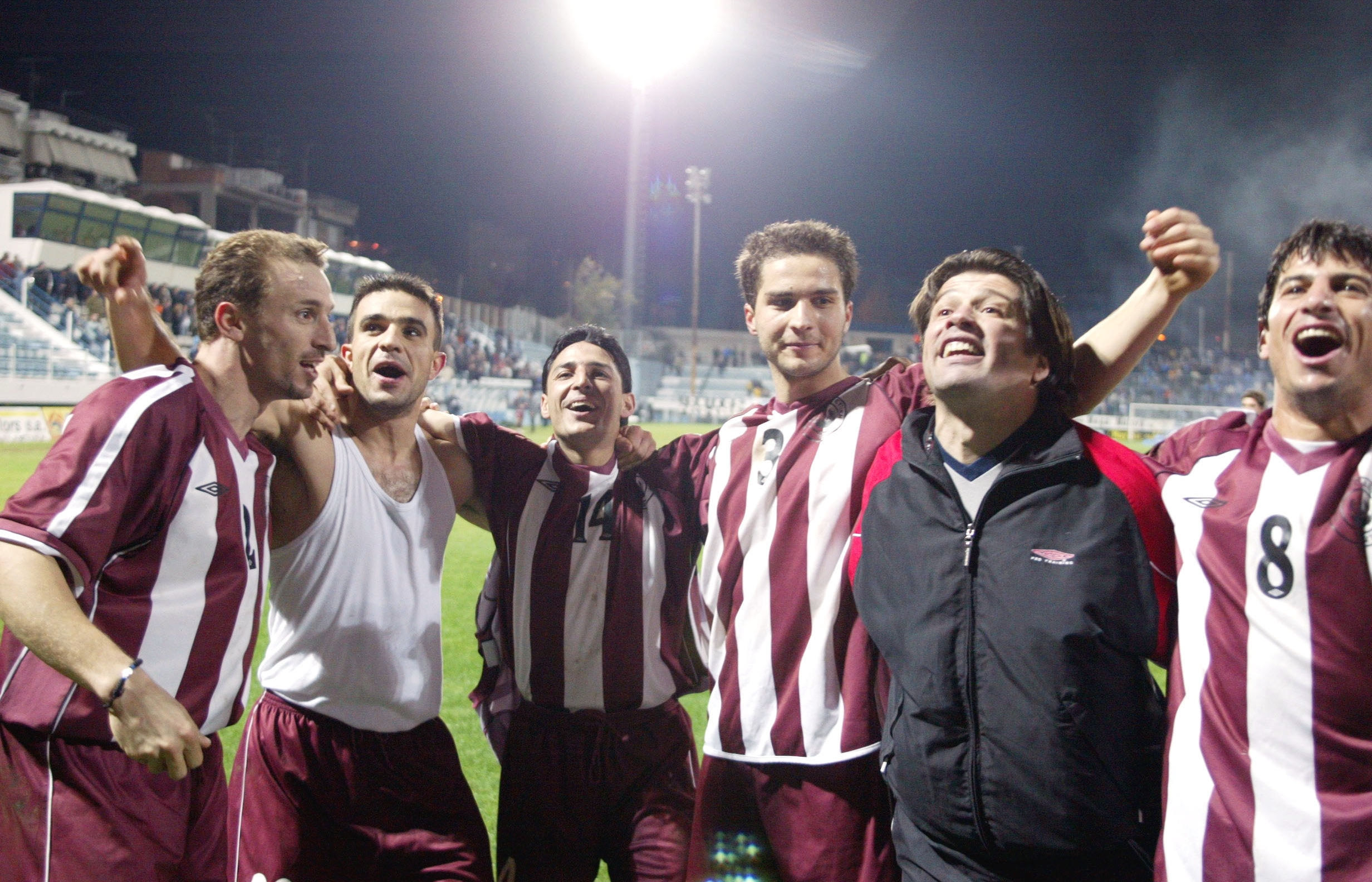 Αγκαλιά με τους παίκτες του μετά τη μεγάλη νίκη μέσα στη Νίκαια επί του Ιωνικού