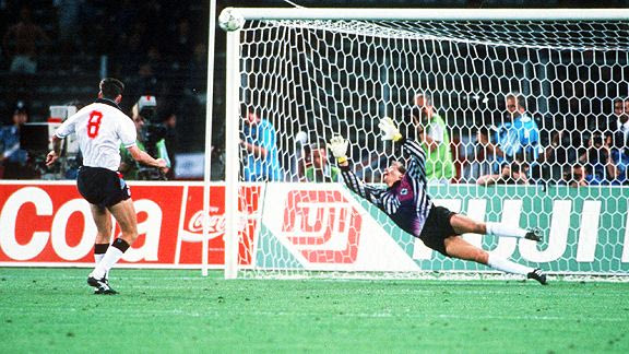Το Μουντιάλ της Ιταλίας του 1990 σημαδεύτηκε όσο κανένα άλλο από τα πέναλτι και μάλιστα ήταν η αρχή της …κατάρας που ακολουθεί την ομάδα της Εθνικής Αγγλίας. Μπροστά σε 63.000 θεατές στο Delle Alpi, θα οδηγηθεί στην ψυχοφθόρα διαδικασία μετά το ισόπαλο 1-1 με την Γερμανία (60′ Μπρέμε / 80′ Λίνεκερ).