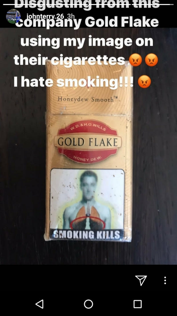 Ο Τζον Τέρι διαπίστωσε ότι γνωστή καπνοβιομηχανία χρησιμοποιεί φωτογραφία του πάνω στα πακέτα της και εκνευρίστηκε.