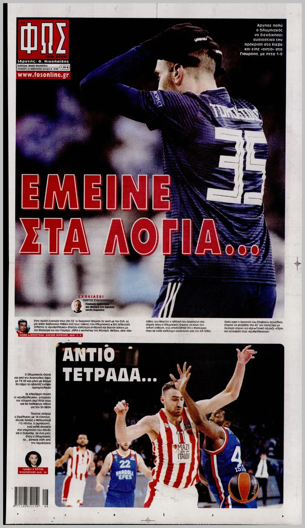 Χαρακτηριστικό είναι πως το ΦΩΣ πούλησε 3.380 φύλλα την επομένη του πρώτου αγώνα του Ολυμπιακού με τη Ντινάμο Κιέβου στο Φάληρο και ήταν τρίτη σε πωλήσεις επί συνόλου οκτώ αθλητικών εφημερίδων. Η “SportDay” με 4.470 φύλλα και η “Live Sport” με 3.440 φύλλα βρέθηκαν στις δυο πρώτες θέσεις. Θα περίμενε ίσως κάποιος να “τσιμπούσε” κάτι παραπάνω έπειτα από μια μεγάλη ευρωπαϊκή μάχη των Πειραιωτών, όμως έχει να ανταγωνιστεί και τον “Πρωταθλητή”.
