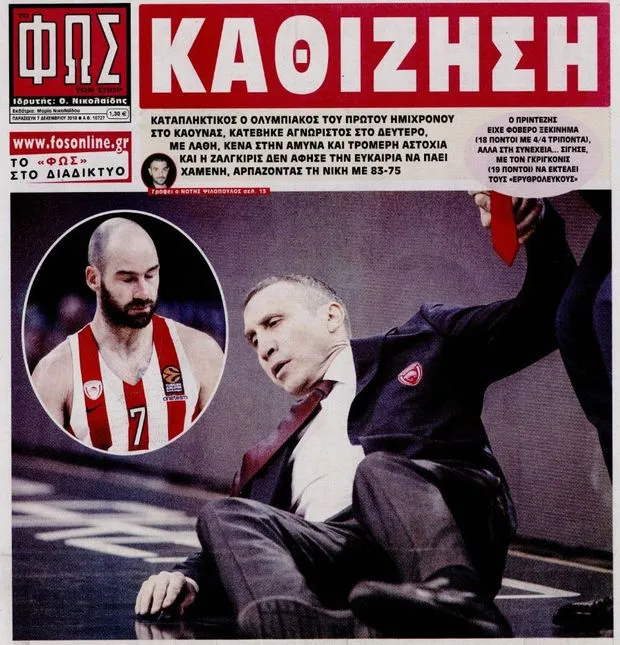 Επίσης, επιεικώς άστοχο μπορεί να χαρακτηριστεί το πρωτοσέλιδο της 7ης Δεκεμβρίου 2018, μετά τον αγώνα του μπασκετικού Ολυμπιακού στο Κάουνας με τη Ζαλγκίρις. Το “ΦΩΣ” βγήκε με τίτλο “ΚΑΘΙΖΗΣΗ”, θέλοντας να στηλιτεύσει την κακή εικόνα της ομάδας του Ντέιβιντ Μπλατ στο δεύτερο 20λεπτο και την ήττα με 83-75, δείχνοντας τον Αμερικανοϊσραηλινό πεσμένο στο παρκέ. Ως γνωστόν, ο Μπλατ έχει ένα πρόβλημα υγείας, το οποίο δυσκολεύει αρκετά τη βάδισή του, όπως και το να σταθεί όρθιος και η διεύθυνση για σημειολογικούς λόγους επέλεξε αυτό το φωτογραφικό στιγμιότυπο.