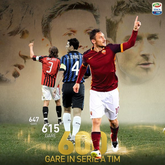 Η αναμέτρηση με την Κιέβο Βερόνα στο τελευταίο εντός έδρας ματς της Ρόμα για τη φετινή σεζόν ήταν ξεχωριστή για τον Φραντσέσκο Τότι. Ο Λουτσιάνο Σπαλέτι έριξε στο ματς τον καπιτάνο στο 59ο λεπτό (αντί του Σαλάχ) και εκείνος συμπλήρωσε 600 παιχνίδια στο Καμπιονάτο με τη φανέλα της Ρόμα, με το νούμερο αυτό να προκαλεί δέος αν αναλογιστεί κανείς ότι οι μόνοι που τον ξεπερνούν έχοντας αγωνιστεί σε έναν μόνο σύλλογοι είναι οι Πάολο Μαλντίνι (647 ματς) και Χαβιέρ Σανέτι (615).