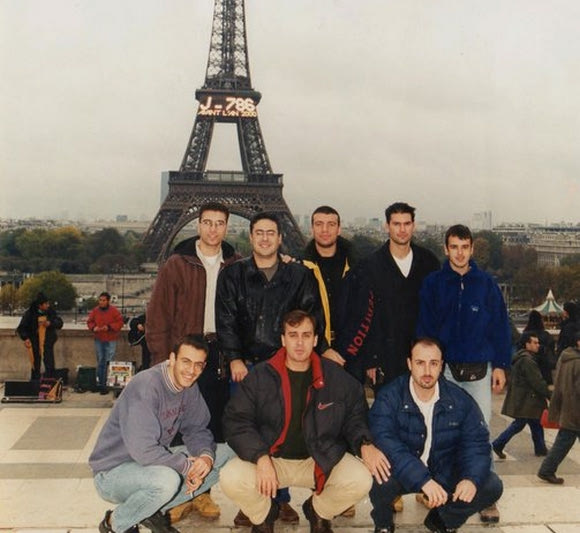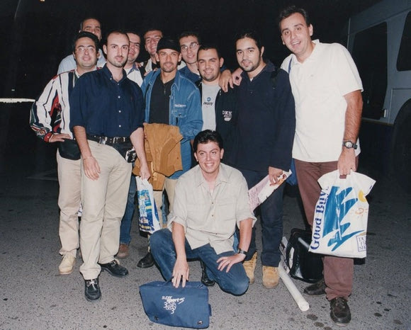 Στο αεροδρόμιο της Μπολόνια οι δημοσιογράφοι της ΑΕΚ συναντούν τον Ρομπέρτο Μπάτζιο και δεν χάνουν την ευκαιρία για μία φωτογραφία. Κάτω είναι ο νυν Διευθυντής επικοινωνίας της ΚΑΕ ΑΕΚ, Γιώργος Νικολάου