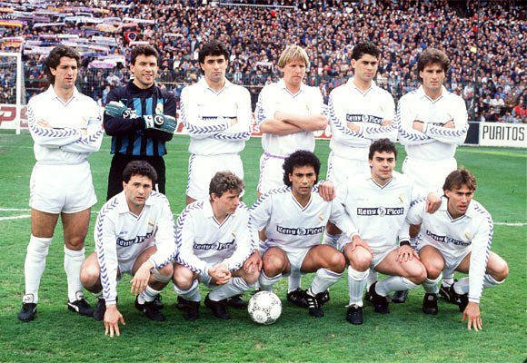 Η ομάδα της Ρεάλ που πέτυχε τα 107 γκολ τη σεζόν 1989/90. Πίσω, από αριστερά: Τσέντο, Μπούγιο, Μίτσελ, Σούστερ, Ιέρο, Ρουγκέρι. Μπροστά, από αριστερά: Γορδίγιο, Μπουτραγκένιο, Ούγκο Σάντσες, Σαντσίς, Μαρτίν Μπάθκεθ