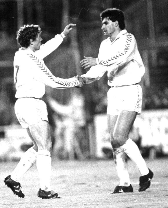 17. Στο ίδιο παιχνίδι, με τη Δανία, ο Μπουτραγκένιο πανηγυρίζει ένα από τα τέσσερα γκολ του (18/6/1986)
