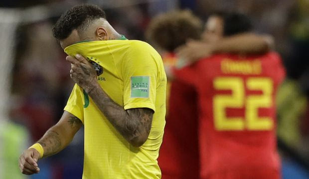 Brazil's Neymar reacts as Belgium players celebrate after Brazil is knocked out by Belgium following their quarterfinal match at the 2018 soccer World Cup in the Kazan Arena, in Kazan, Russia, Friday, July 6, 2018. (AP Photo/Andre Penner)