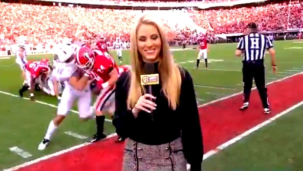 Η ρεπόρτερ αγωνιστικού χώρου, Λάουρα Ράουτλετζ, βρισκόταν σε ζωντανή σύνδεση όταν συνέβη το απροσδόκητο. Παίκτες αμερικάνικου ποδοσφαίρου μονομάχησαν σε διεκδίκηση και την πήραν... παραμάζωμα. Το video δεν άργησε να γίνει viral και πλησιάζει 10.000.000 προβολές.