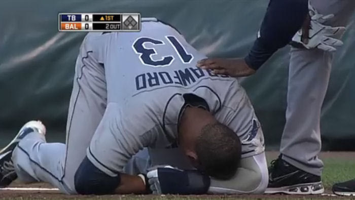 Το μεγάλο αστέρι των Tampa Bay Rays Καρλ Κράουφορντ, είχε ένα περίεργο ατύχημα κατά τη διάρκεια του αγώνα μπέιζμπολ κόντρα στους Baltimore Orioles.