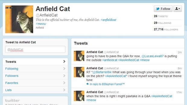 Συγκεκριμένα κάποιος άγνωστος άνοιξε προφίλ στο δημοφιλές κοινωνικό δίκτυο με το όνομα Anfield Cat ( @AnfieldCat), λογαριασμός που το απόγευμα της Τρίτης είχε συγκεντρώσει περισσότερους από 27.000 followers!