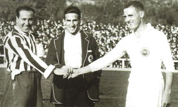 Δεξιά ο Σαντιάγο Μπερναμπέου, αρχηγός της Ρεάλ Μαδρίτης και αριστερά ο Πολόλο, αρχηγός της Ατλέτικο Μαδρίτης από αγώνα του 1917