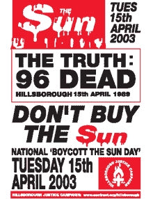 Η αντιπαλότητα των ανθρώπων του Λίβερπουλ γενικά με τη “Sun” ήταν πάρα πολύ μεγάλη μετά από το περιβόητο πρωτοσέλιδο της επόμενης ημέρας της τραγωδίας. Ενδεικτική η παραπάνω φωτογραφία, η οποία καλεί τους πάντες να μποϊκοτάρουν την εν λόγω εφημερίδα, η οποία πάντως είναι πρώτη σε πωλήσεις στις μέρες μας.