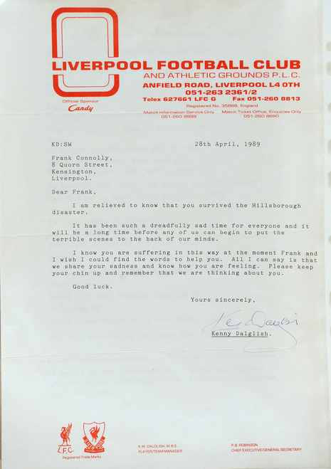 Ένας από τους επιζώντες της τραγωδίας ήταν ο Φρανκ Κόνολι, στον οποίο ο Κένι Νταλγκλίς, προπονητής της Λίβερπουλ, έστειλε ένα γράμμα τρεις μέρες μετά. Μεταξύ άλλων, του ζητούσε συγγνώμη για όλα όσα είδε. Το εν λόγω γράμμα δημοσιεύτηκε σήμερα (15/4/13) από τη Liverpool Echο.