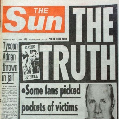 Την επομένη της τραγωδίας η “Sun” καταφέρθηκε κατά των οπαδών της Λίβερπουλ με τον ιστορικό τίτλο “The truth” (η αλήθεια). Σύμφωνα με την εφημερίδα υπήρχαν φίλοι της Λίβερπουλ που έκλεβαν θύματα, ενώ άλλοι ουρούσαν.