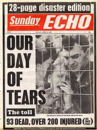 Εντελώς διαφορετικό το πρωτοσέλιδο της Liverpool Echo. Το πρωτοσέλιδο της τοπικής εφημερίδας της πόλης αναφερόταν στις 93 αδικοχαμένες ζωές και στους πάνω από 200 τραυματίες. Λίγο μετά ο αριθμός αυξήθηκε στους 95, ενώ το 96ο θύμα άφησε την τελευταία του πνοή τρία χρόνια μετά σε θάλαμο εντατικής παρακολούθησης.