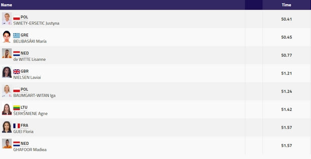 Η πρωταθλήτρια του Κώστα Ηλία έκανε πολύ καλή και ισορροπημένη κούρσα και έχασε στην ουσία πάνω στη γραμμή του τερματισμούαπό τηνΠολωνήΤζαστίνα Σβάιτι- Ερσετικ που .εφτασε στον τερματισμό με αρκετές δυνάμεις καιτερμάτισε πρώτη σε 50.41, επίδοση που είναι η κορυφαίαστην Ευρώπη, ενώ τρίτη ήταν η Ολλανδή Λισάν ντε Βίτε με 50.77.