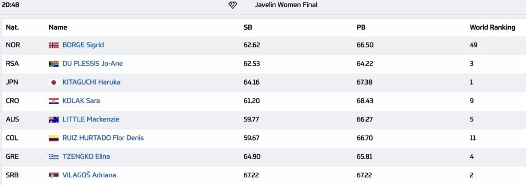 Το έκτο μίτινγκ της σειράς των διαμαντιών έχει έντονο ελληνικό ενδιαφέρον. Η Τζένγκο θα διεκδικήσει την τέταρτη νίκη της σε Diamond League τη φετινή σεζόν. Η πρωταθλήτρια Ευρώπης στον ακοντισμό έχει φετινό ρεκόρ στα 64,90 μ. από τις 3 Μαΐου στην παρουσία της στο Diamond League του Κετσιάο.