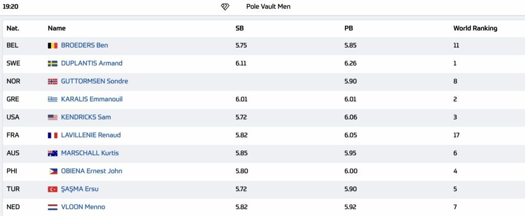Ο Εμμανουήλ Καραλής, από την άλλη, ετοιμάζεται για τον πέμπτο αγώνα της θερινής σεζόν. Ο πρωταθλητής Ευρώπης στο άλμα επί κοντώ έχει καλύτερη επίδοση στα 6,01 μ. φέτος, άλμα που του είχε δώσει τη δεύτερη θέση στο Damond League του Κετσιάο στις 3 Μαΐου.