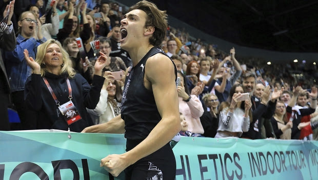 Armand Duplantis of Sweden celebrates after setting a new World Record (6.17) in the men's Pole Vault final during the indoor athletics meeting Orlen Copernicus Cup 2020 in Torun, Poland, Saturday Feb. 8, 2020. (AP Photo/Slawek Kowalski)