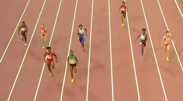 Φυσικά δεν ακυρώθηκε, γιατί διήνυσε μεγαλύτερη απόσταση. Η Βρετανίδα αιφνιδιάστηκε από την εισβολή της Τζαμαϊκανής, αλλά συνέχισε να τρέχει γρήγορα και πήρε την απευθείας πρόκριση στα ημιτελικά με την τρίτη θέση και τον χρόνο των 23.10 δευτερολέπτων.