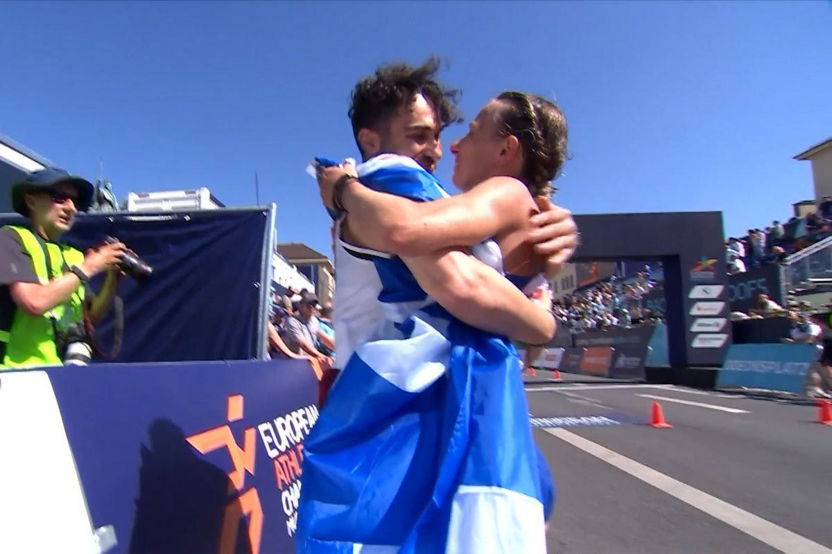 Η Αντιγόνη Ντρισμπιώτη κατέκτησε το χρυσό μετάλλιο στα 35χλμ βάδην στο ευρωπαϊκό πρωτάθλημα στίβου και αμέσως μετά έσπευσε να αγκαλιάσει και να φιλήσει τον σύζυγό της.