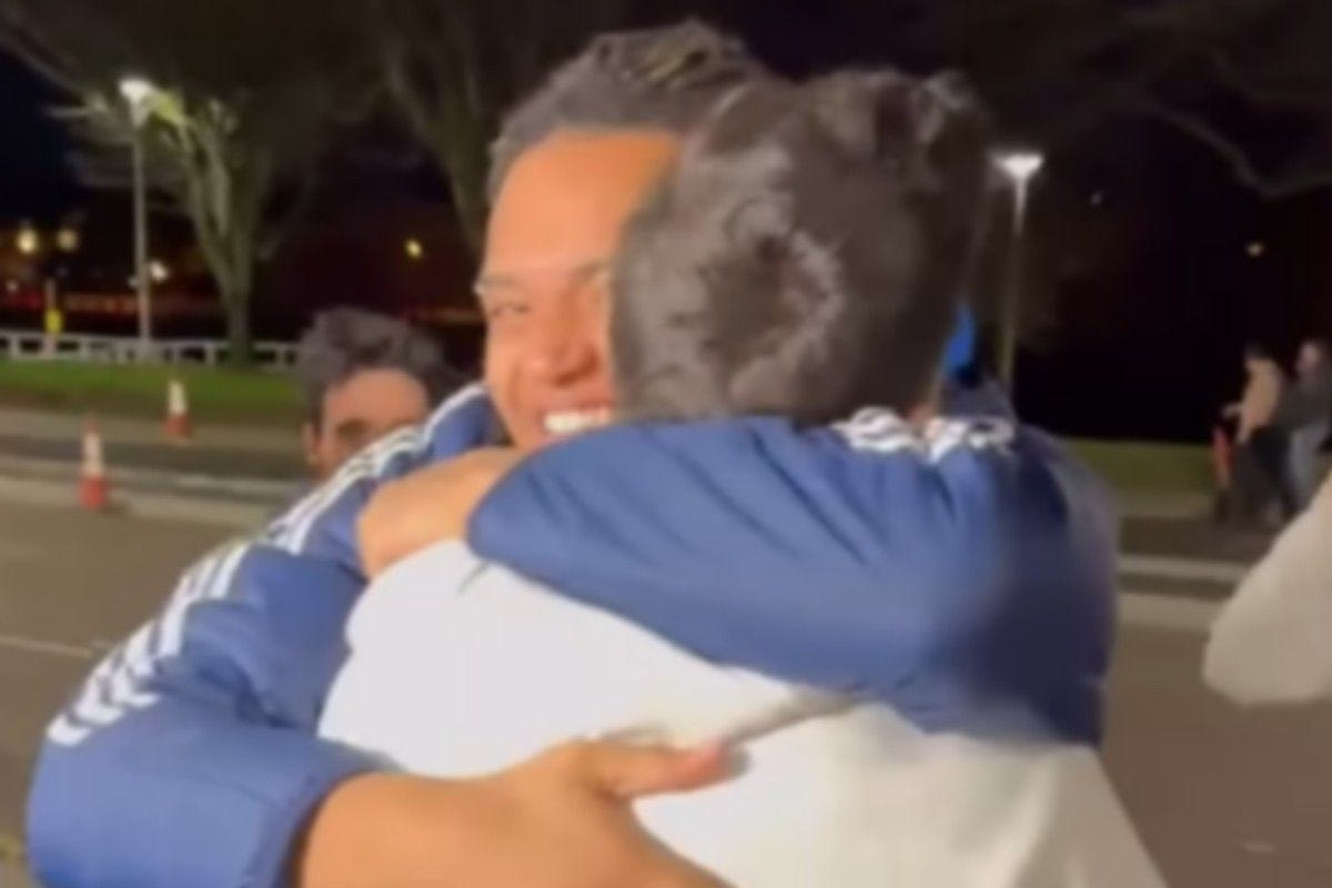 Τα μέλη της αποστολής του αντιπροσωπευτικού μας συγκροτήματος τον υποδέχθηκαν στο ξενοδοχείο, με τον Μίλτο Τεντόγλου να τον αγκαλιάζει σε μία όμορφη στιγμή μεταξύ των δύο αθλητών.