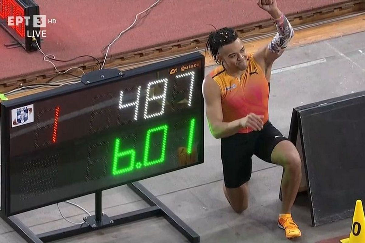 Ολοκληρώνοντας τον αγώνα του -αφού έκανε και μια άκαρπη προσπάθεια στα 6.08 μέτρα- ο χάλκινος Ολυμπιονίκης του Παρισιού πήγε και πόζαρε πανευτυχής δίπλα στον φωτεινό πίνακα που αναγραφόταν το ιστορικό 6.01.
